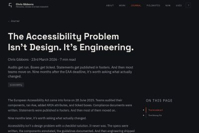 Chris argumentiert, dass Accessibility-Probleme keine Design-Versäumnisse sind - sondern Engineering-Fehler. Der Fullstack-Trend hat Teams um spezialisiertes Frontend-Wissen gebracht, während KI-Tools wie Copilot für Entwickler ohne Grundlagen fehlerhaften Code im großen Stil erzeugen. Automatisierte Tools finden laut UK GDS nur 30 % der Probleme, doch die meisten Organisationen betrachten Compliance nach einem axe-Durchlauf als erledigt. Neun Monate nach der EAA-Deadline wächst die Lücke zwischen WCAG-Checklisten und tatsächlich nutzbaren Interfaces weiter.