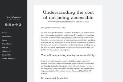 134 issues per audit, 7 hours to fix each, $2,590 per bug - Karl Groves calculates $347,060 in disruption costs for one audit cycle. He calls the audit-fix-repeat loop "the worst accessibility strategy" and argues only prevention during development breaks it.