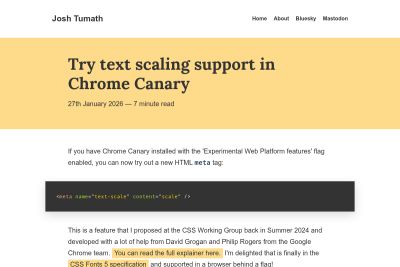 37% of Android users have changed their system text size - but mobile browsers ignore it. Josh Tumath from the BBC introduces an opt-in meta tag in Chrome Canary that respects these settings. CSS guidance included (rem/em for content, px for spacing) - a parallel to the viewport meta tag era.